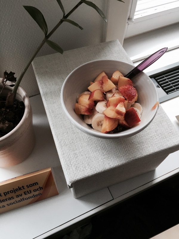 Ett bra frukost- och fikatips är keso med banan, persika och lite kanel! Istället för att äta bröd eller fikabröd på jobbet kan du enkelt och snabbt hacka frukt och ta en sked keso och blanda, så vips har du en härlig fruktsallad som fungerar perfekt som fika på jobbet!