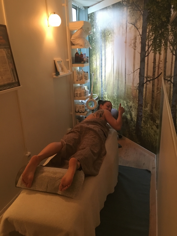 Linnea startade med att få igång blodcirkulationen i ryggen, det kan man göra genom att man ”drar” försigtigt med händerna över ryggen (effleurage på massagespråk) , och det är en väligt behaglig känsla att starta massage på det sättet, och både jag och Milo tyckte det var otroligt skönt. Men sen började Linnea jobba på alla knutar och då började ju vi förstår att det här kommer inte vara behagligt! Haha! Milo hade mindre knutar och ömma muskler än jag men han går på behandlig en gång i månaden så det ger bra resultat för honom. För min del gjorde det sjukt ont på många ställen över rygg och skuldror, nacke, triceps, gluteus och längs höftkammen och nere vid vaderna och utsida/insida lår. Ja för att fatta det kort så var det i hela kroppen!!! Trotts att det gjorde sjukt ont var det så otroligt skänt när man kände att Linnea hade lättat upp musklen och blodet började flöda igen! Idag har jag många blåmärken men jag ser redan fram mot nästa behandling då jag verkligen känner i kroppen att det här var väldigt bra!