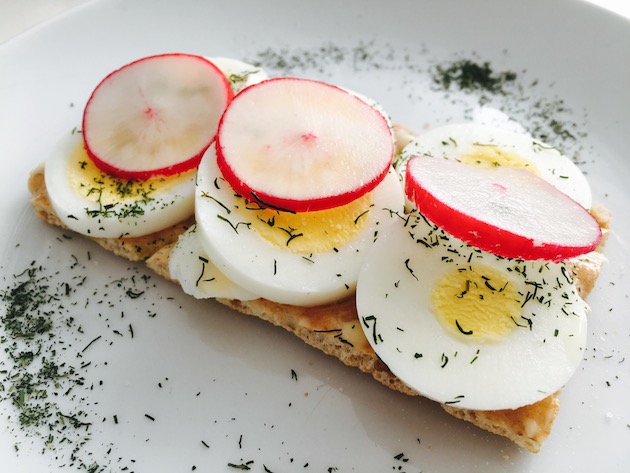 En riktigt läcker frukostsmörgås med skivade rädisor, dill, kokta ägg och havreknäcke! I morse blev det en lugn frukost för mig med en Cappuccino då jag stannade hemma från träningen idag för min halls är inte hundra. Milo var på gymmet däremot och tränade ett pass, han var där redan kl 08.00 och det var tydligen väldigt tomt på människor på gymmet.