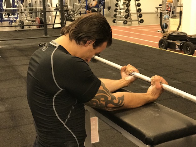 Underarmarna är väldigt uthålliga och därför är det bra att köra fler repititioner av en övning för dem. Milo kör här med en skivstång på 20 kg och gör 4 set med 30 repitioner.