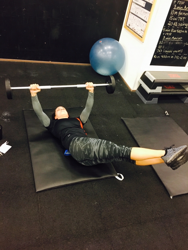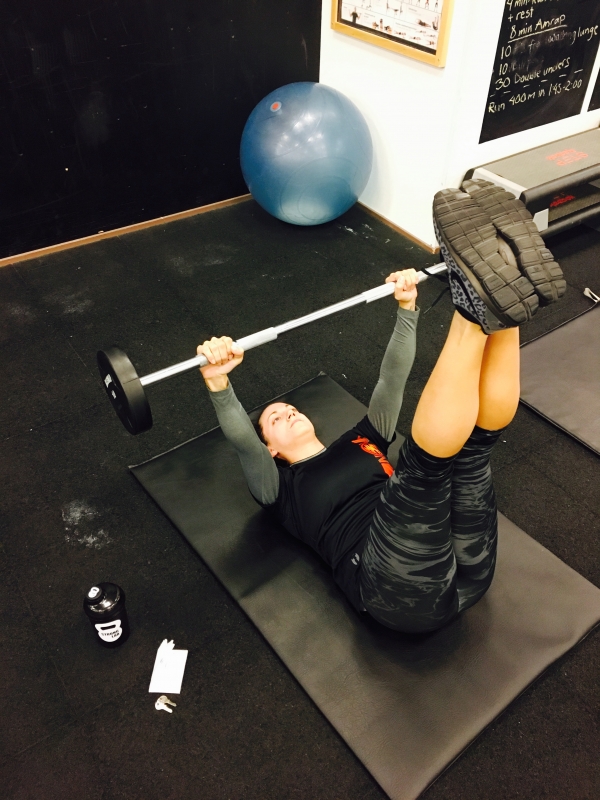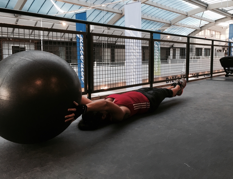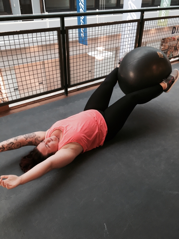 En fantastisk övning för magen är denna där du ligger på golvet och för bollen mellan händerna och fötterna när du möts på mitten! Gå ner så ljupt du kan men ha alltid kvar svanken ner mot marken när du för dina ben nedåt.